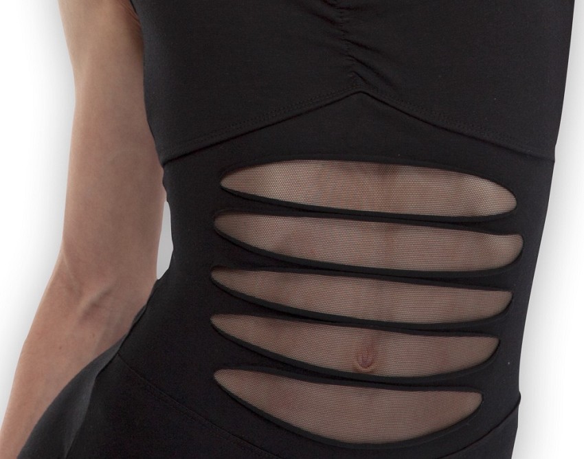 בגד גוף מדליק ואופנתי של פלום מכותנה לייקרה עם כתפיות דקות עיצוב קרעים מקדימה עם שכבת רשת מתחת. כיווץ באיזור החזה. גב חצי פתוח. בטנה באזור החזה.